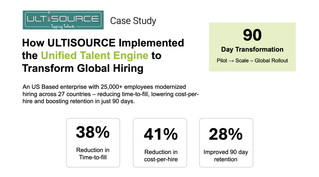 ULTISOURCE partnered with the organization to deploy the Unified Talent Engine — a strategic hiring architecture built to unify processes, accelerate evaluations, and deliver global consistency at scale.